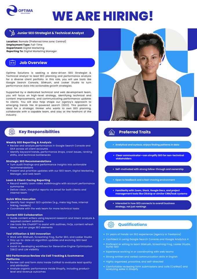 Optima Solutions is looking for a detail-oriented Junior SEO Strategist & Technical Analyst to join our growing digital marketing team.